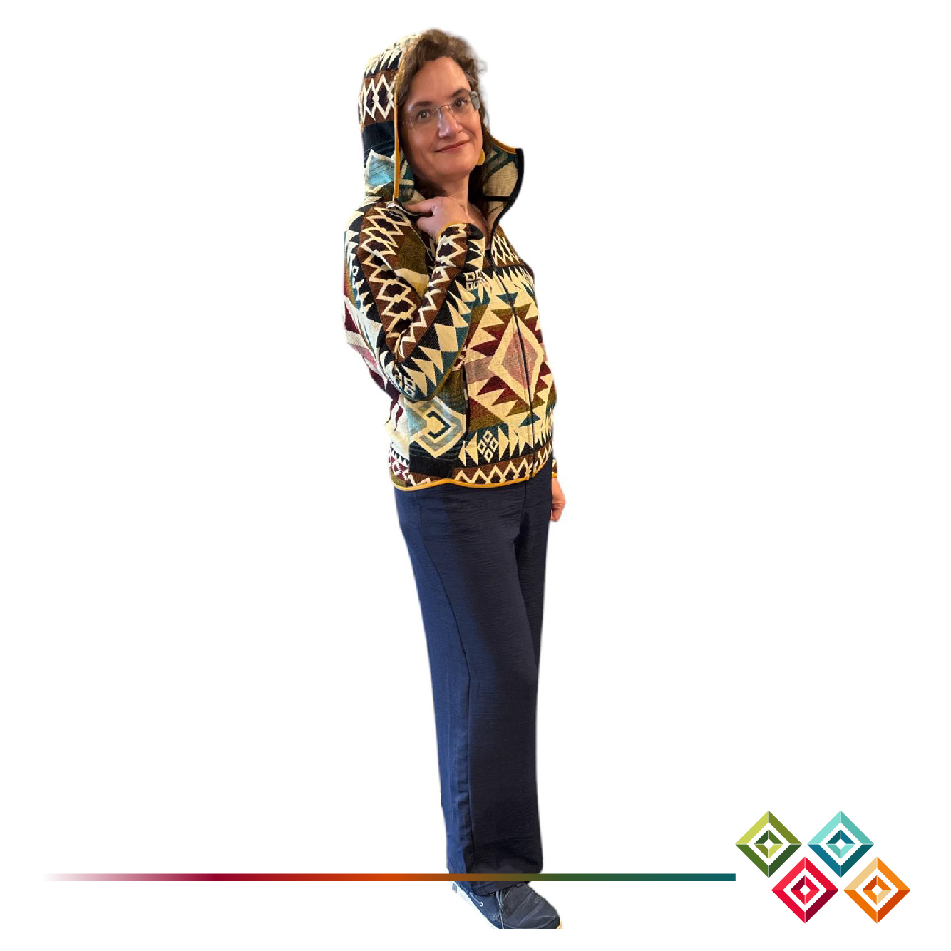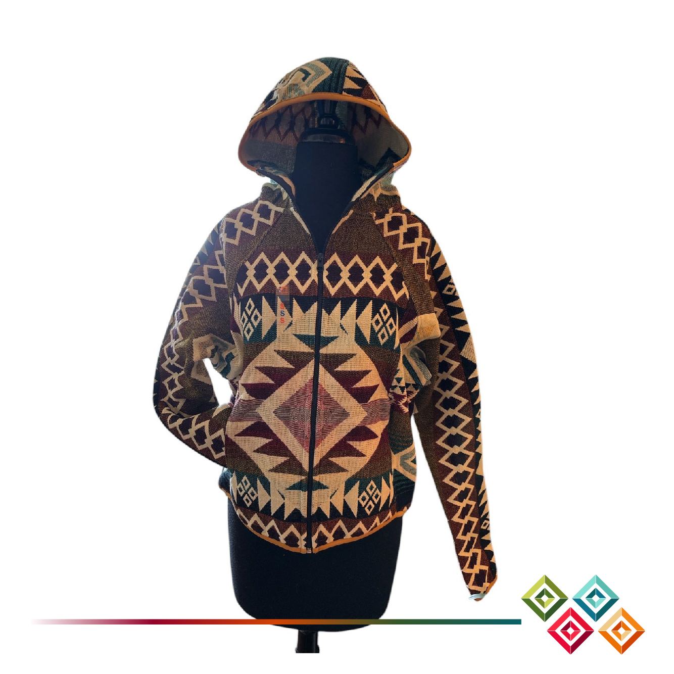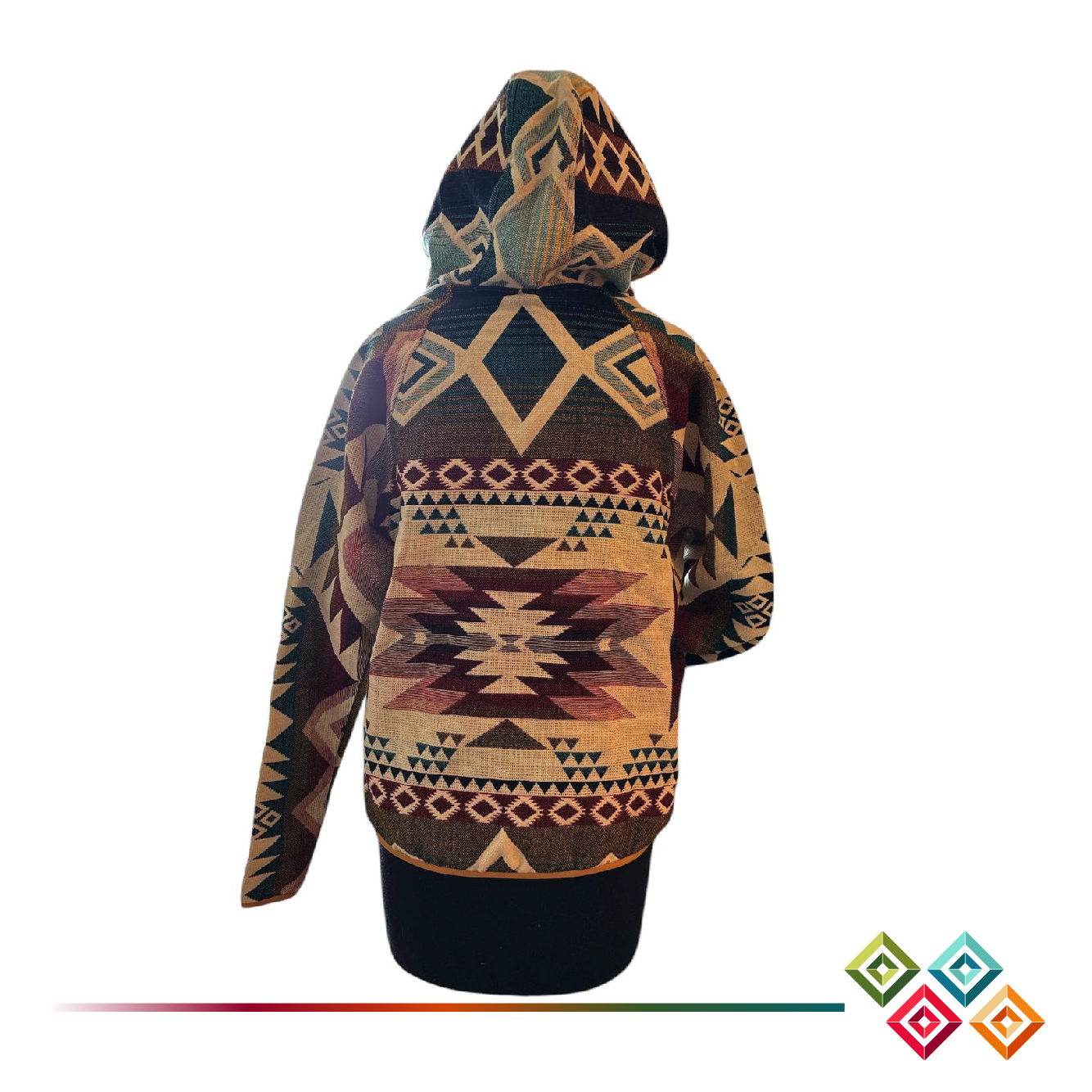 A beautiful and practical piece from our geometric jacket/hood collection. Crafted with richly textured fabric featuring traditional geometric patterns.